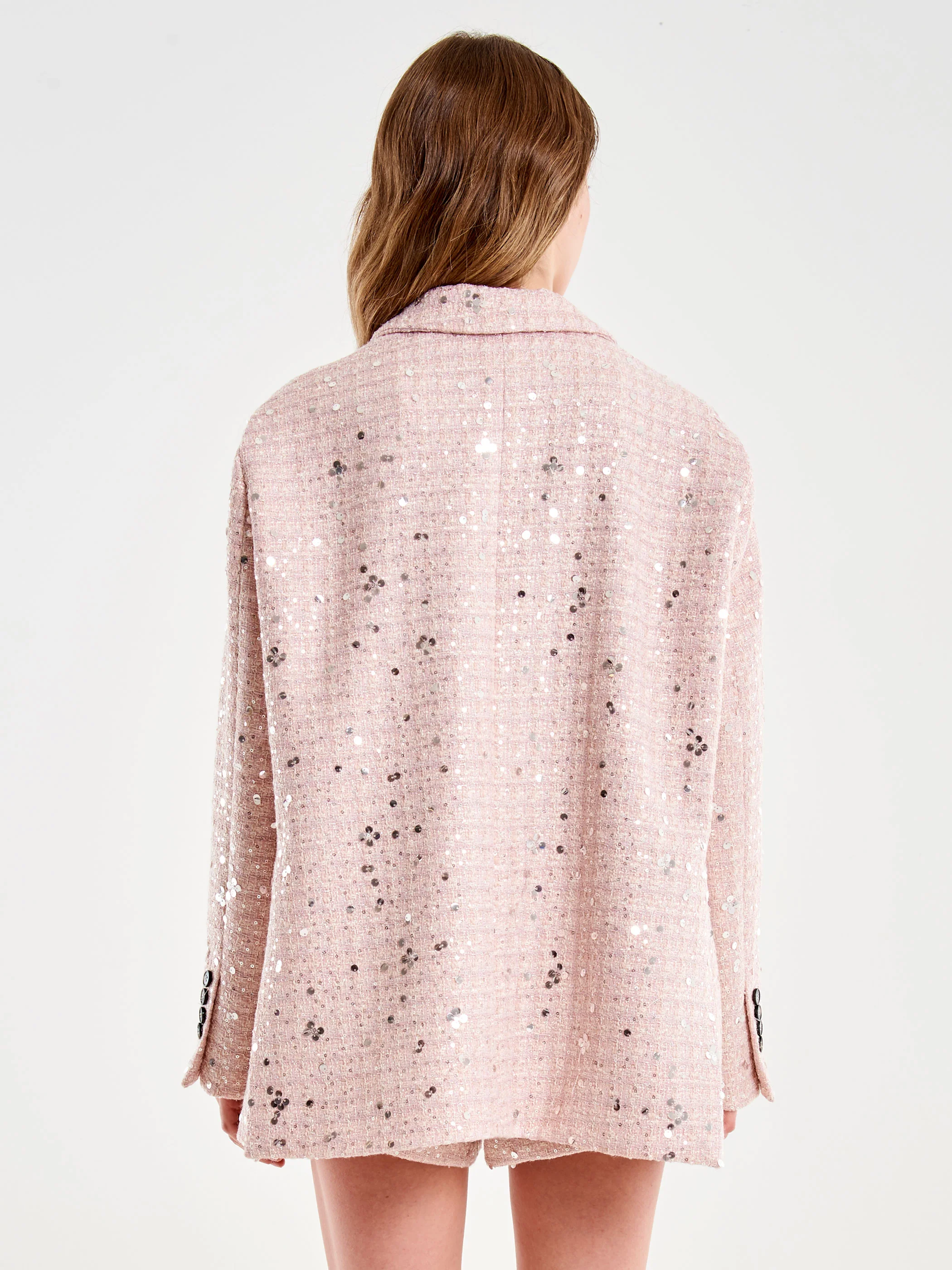 Giacca Blazer oversize con collo a revers e maniche lunghe con bottoni sul polso. Tasche frontali con patta e tasca a filetto sul petto. Chiusura frontale monopetto con bottoni. Dettaglio tessuto lurex e paillettes.