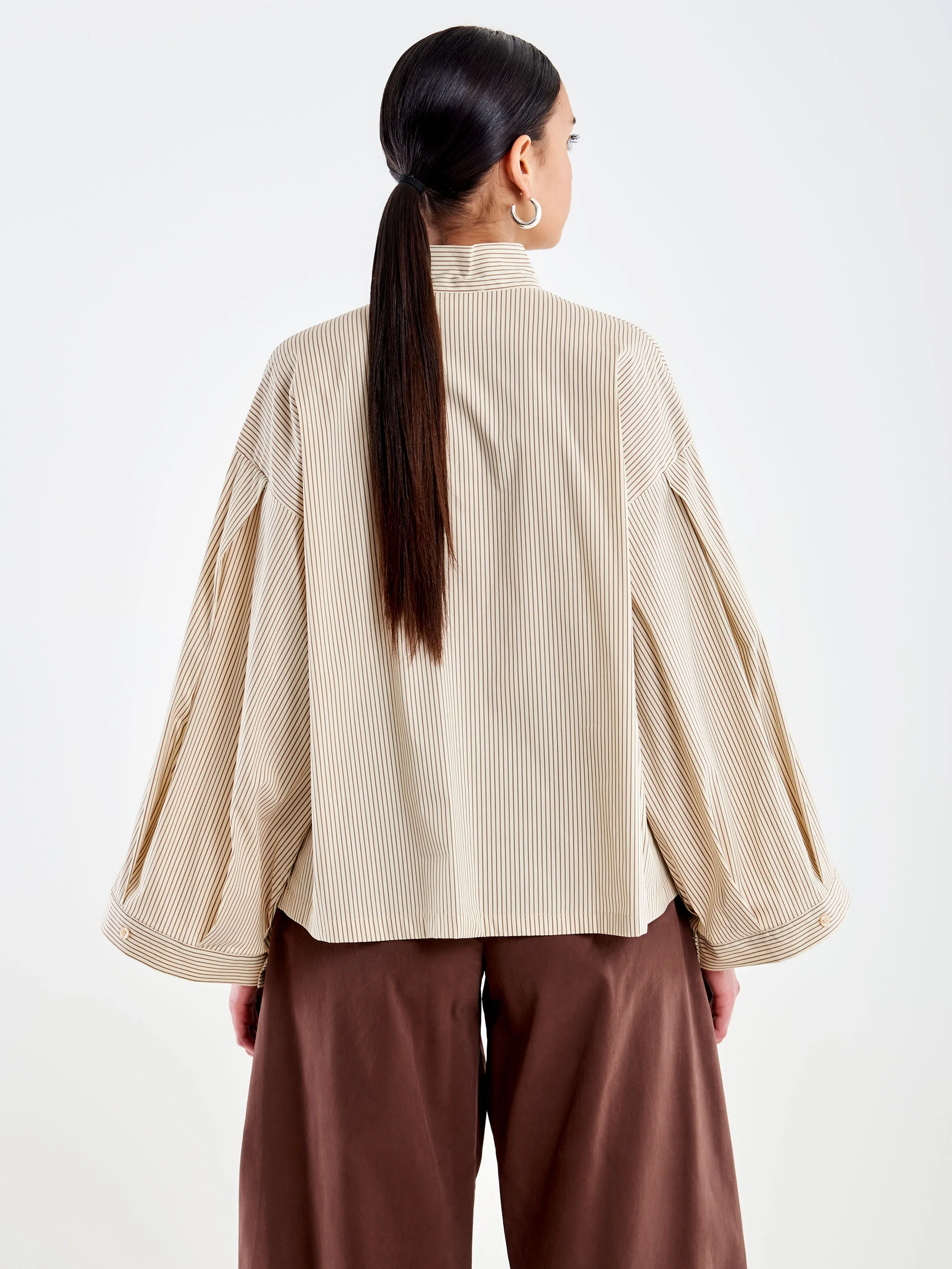 Camicia maniche lunghe ampie a righe. Chiusura frontale con bottoncini e fiocco sul collo.