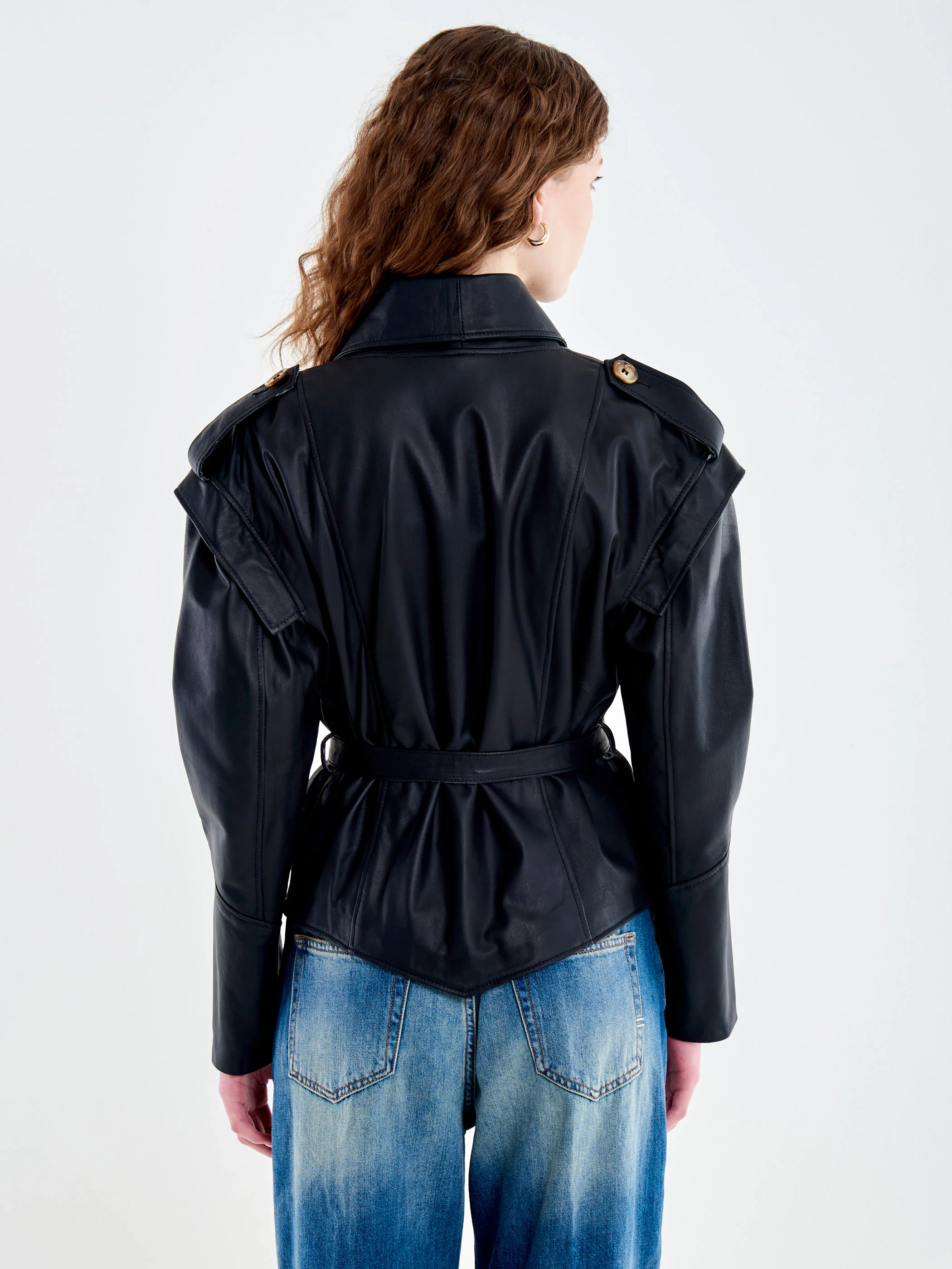 Giacca in pelle incrociata con punte frontali e v posteriore. Dettaglio spalle over con alamari. Maniche affusolate sul fondo. Con cinturina in vita in pelle.Â