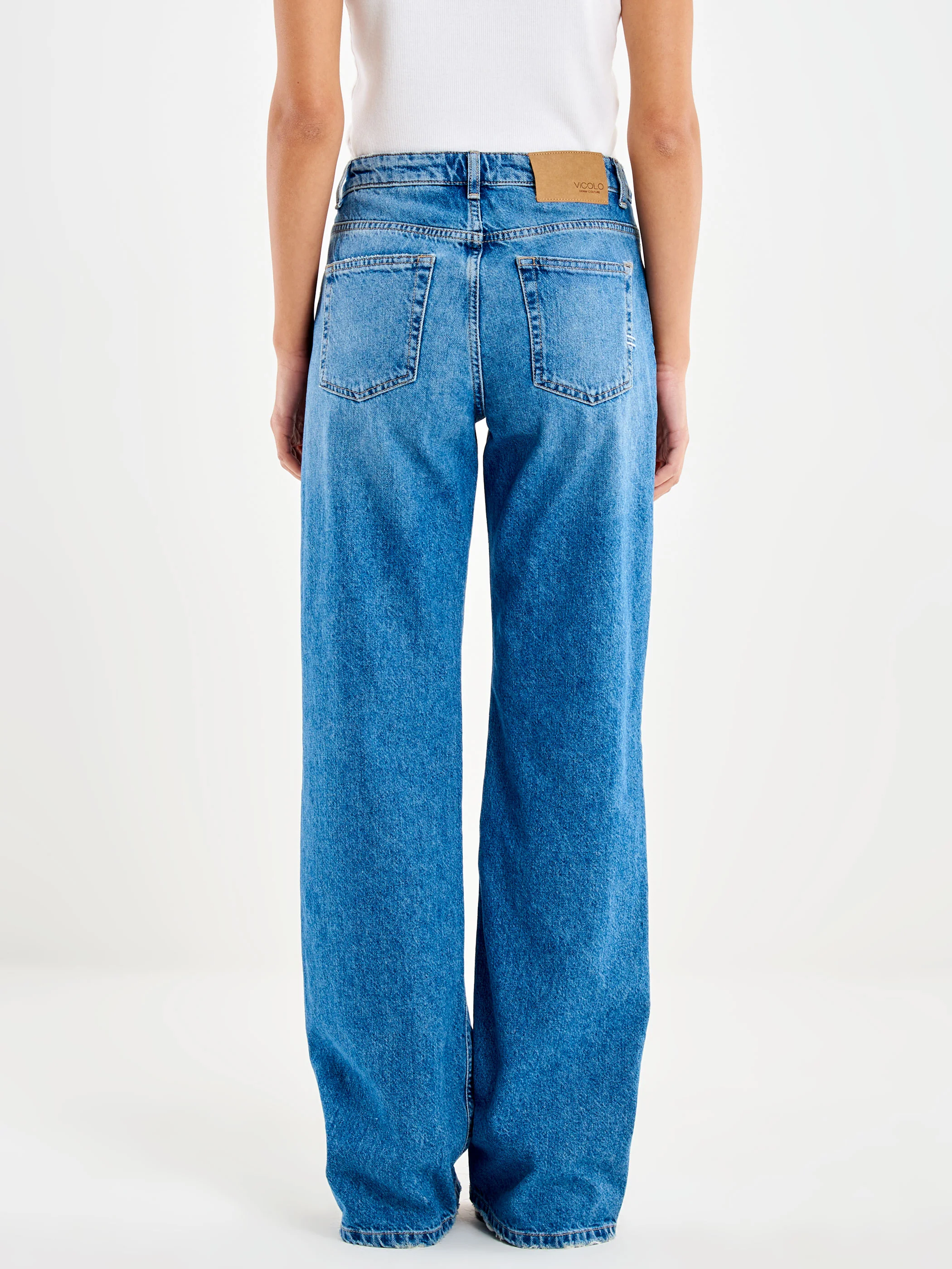 Jeans a vita regolare. Modello cinque tasche. Relaxed Fit, gamba lunga. Chiusura con zip e bottone in metallo. Denim blu.