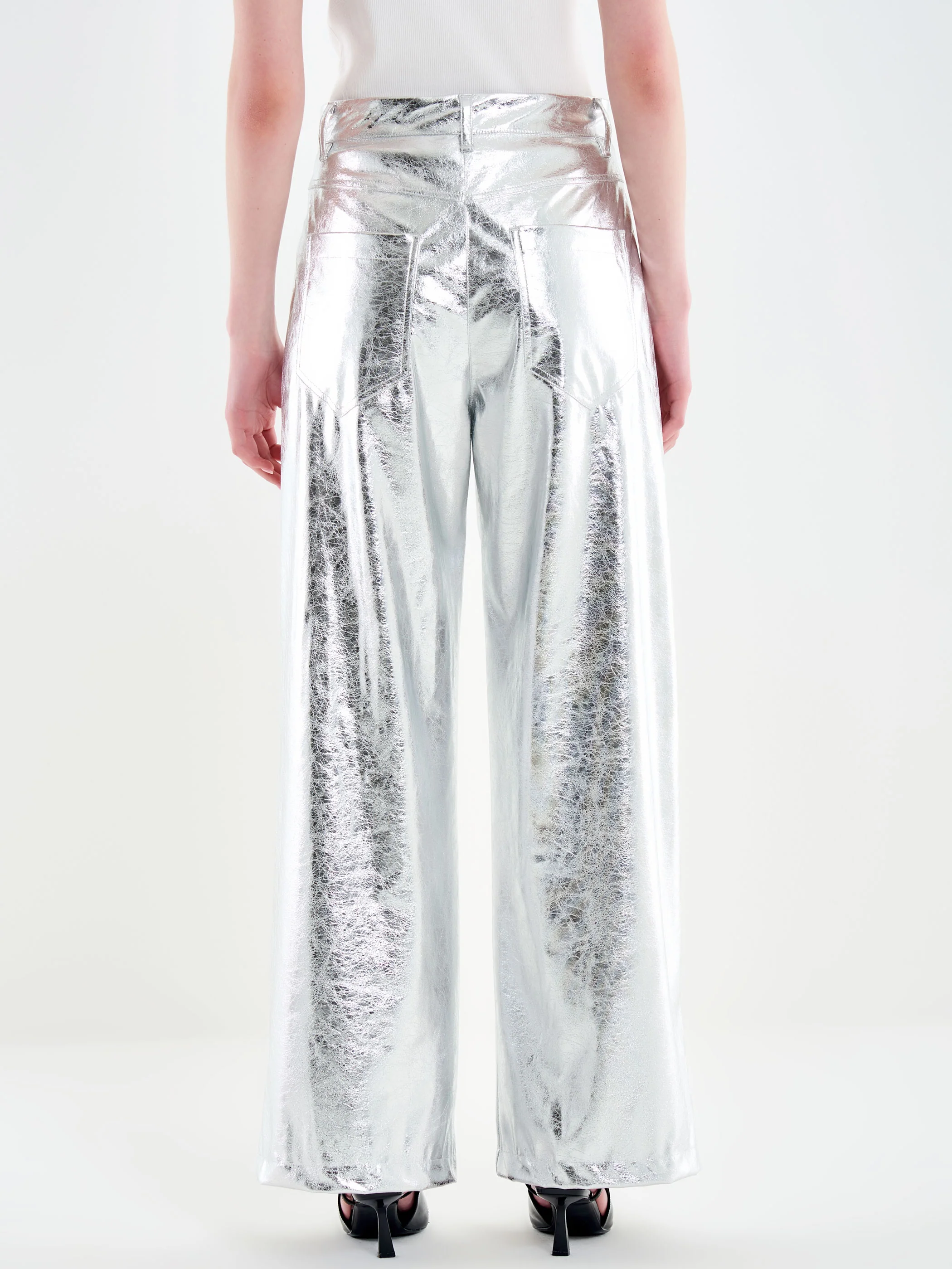 Pantalone ampio in ecopelle in argento. Modello cinque tasche. Chiusura frontale con zip e bottone. Dettaglio ecopelle effetto stropicciato.