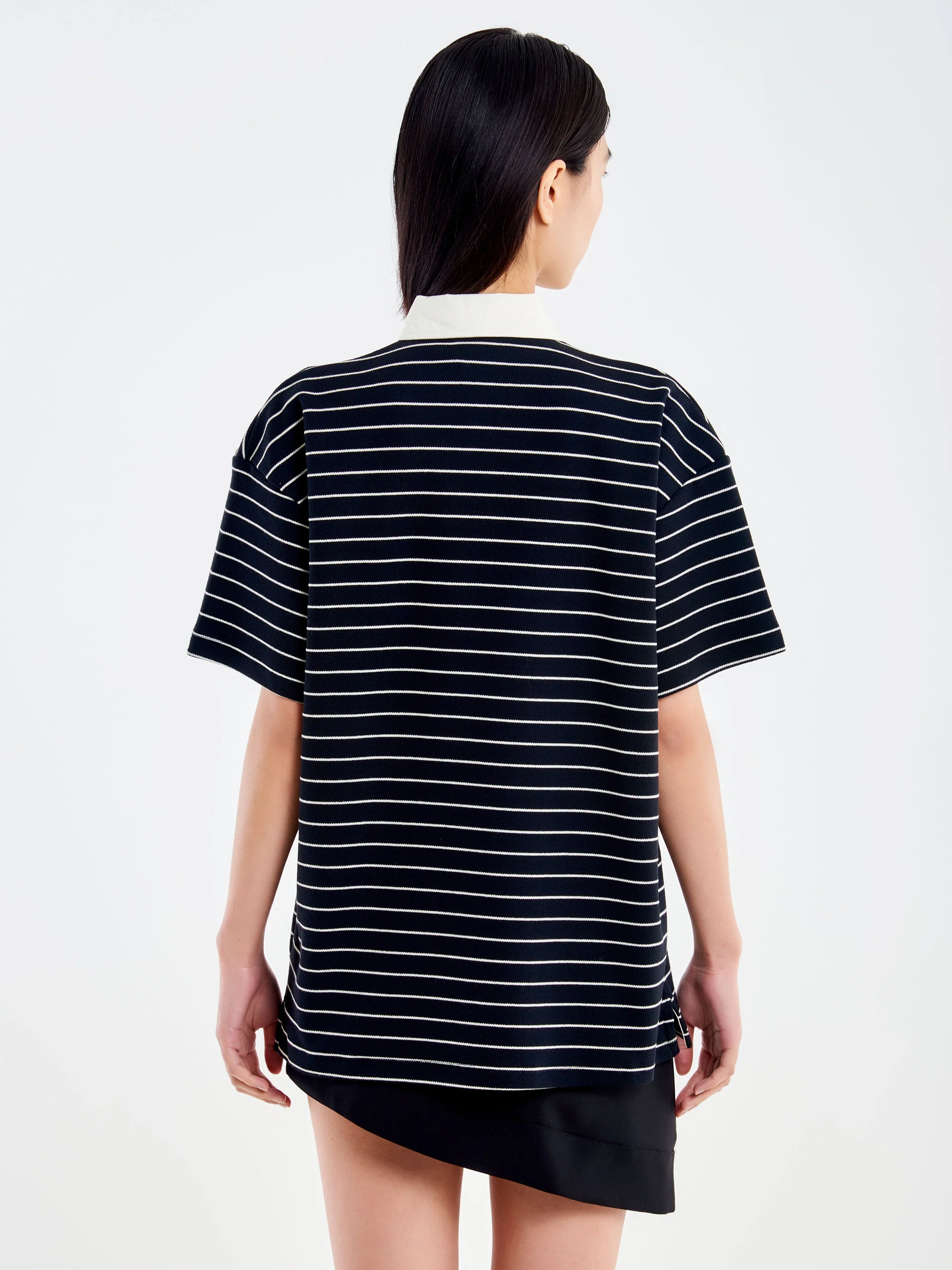 T-shirt modello polo over in jersey mezze maniche. Chiusura con bottoncini. Colletto a contrasto. Tessuto a righe.