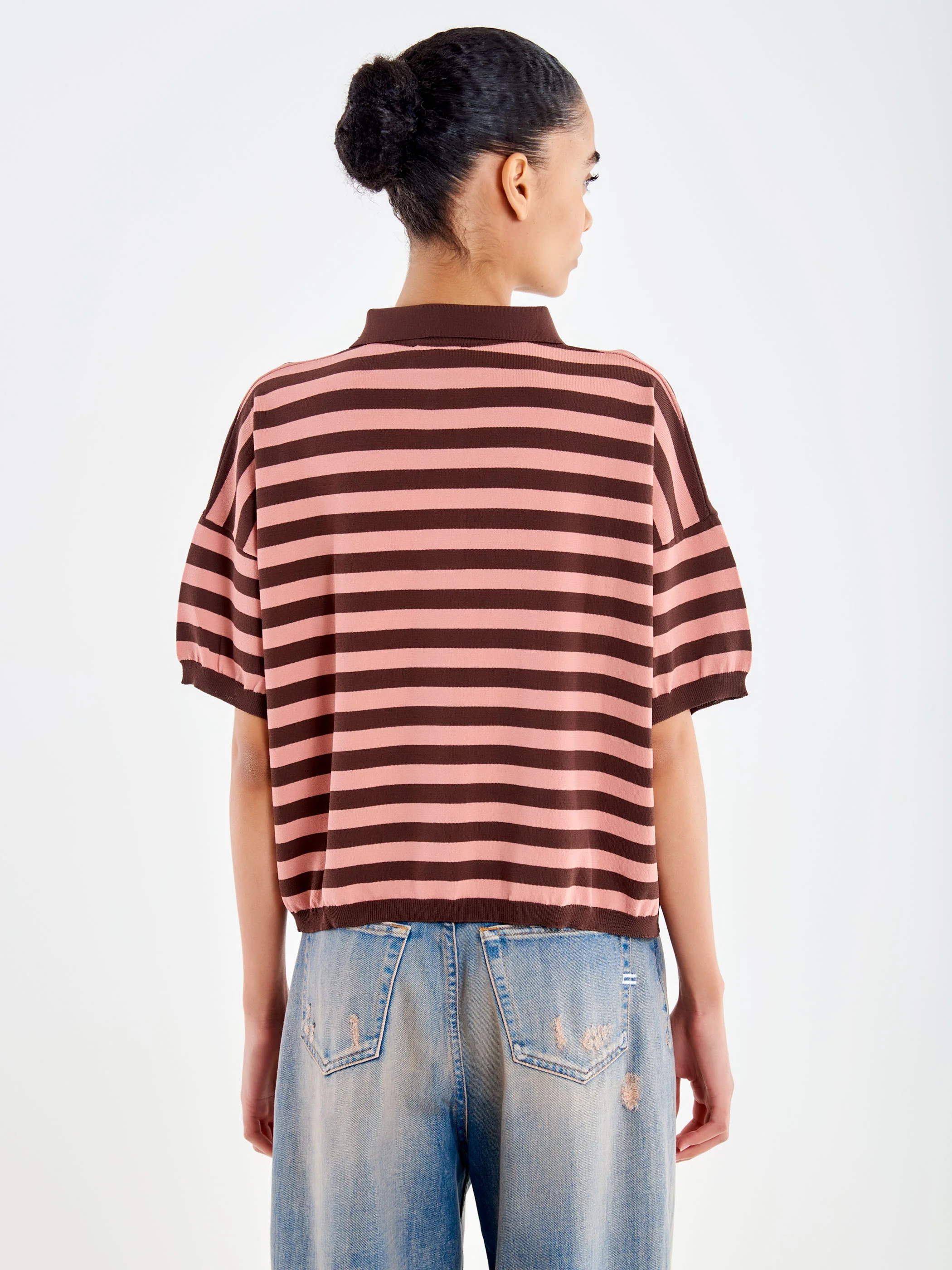 Polo a righe maniche corte in viscosa. Colletto a contrasto. Dettagli in maglia a righe.