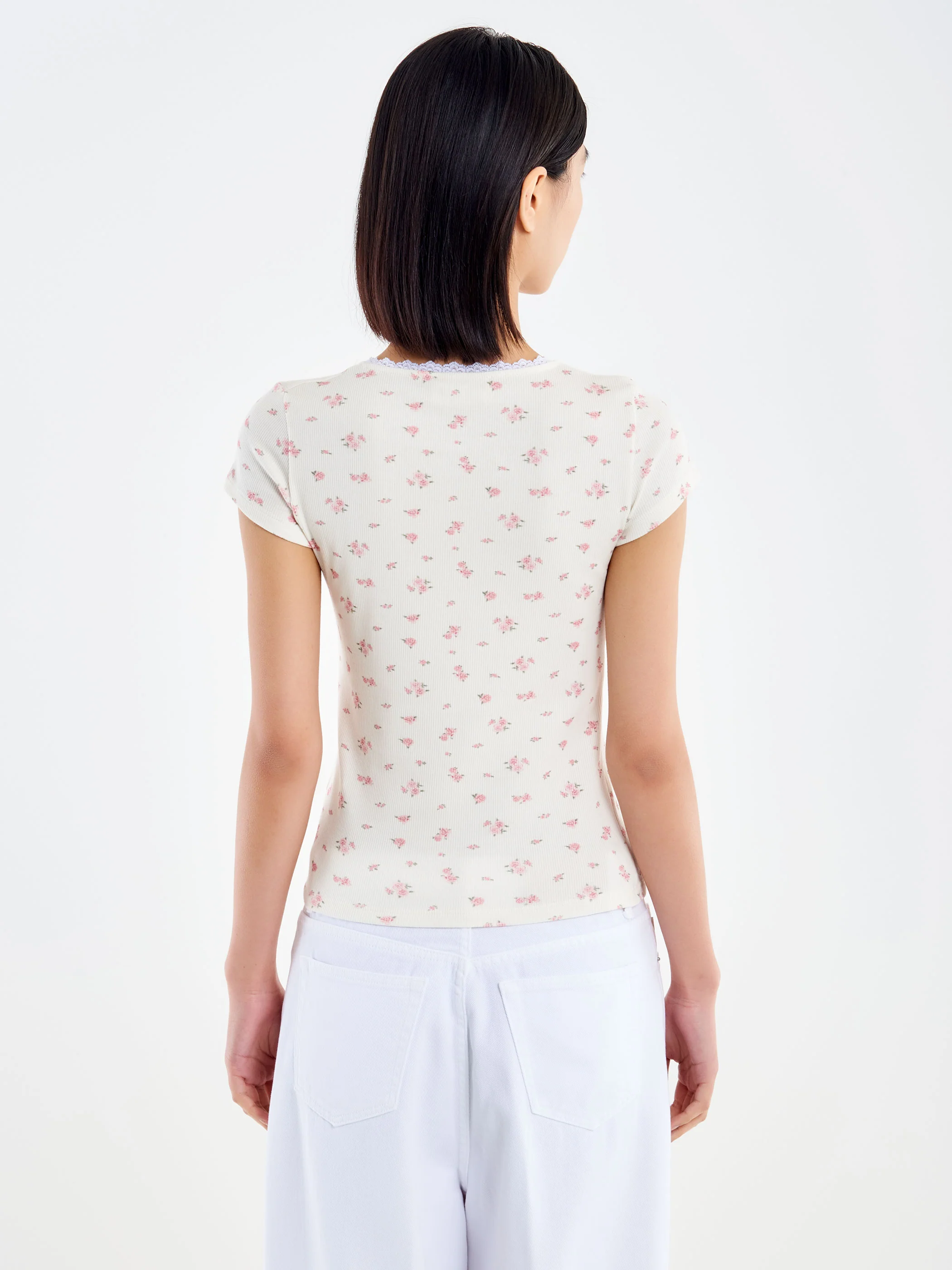 T-shirt cropped maniche corte a costine con profilo in pizzo sul girocollo.