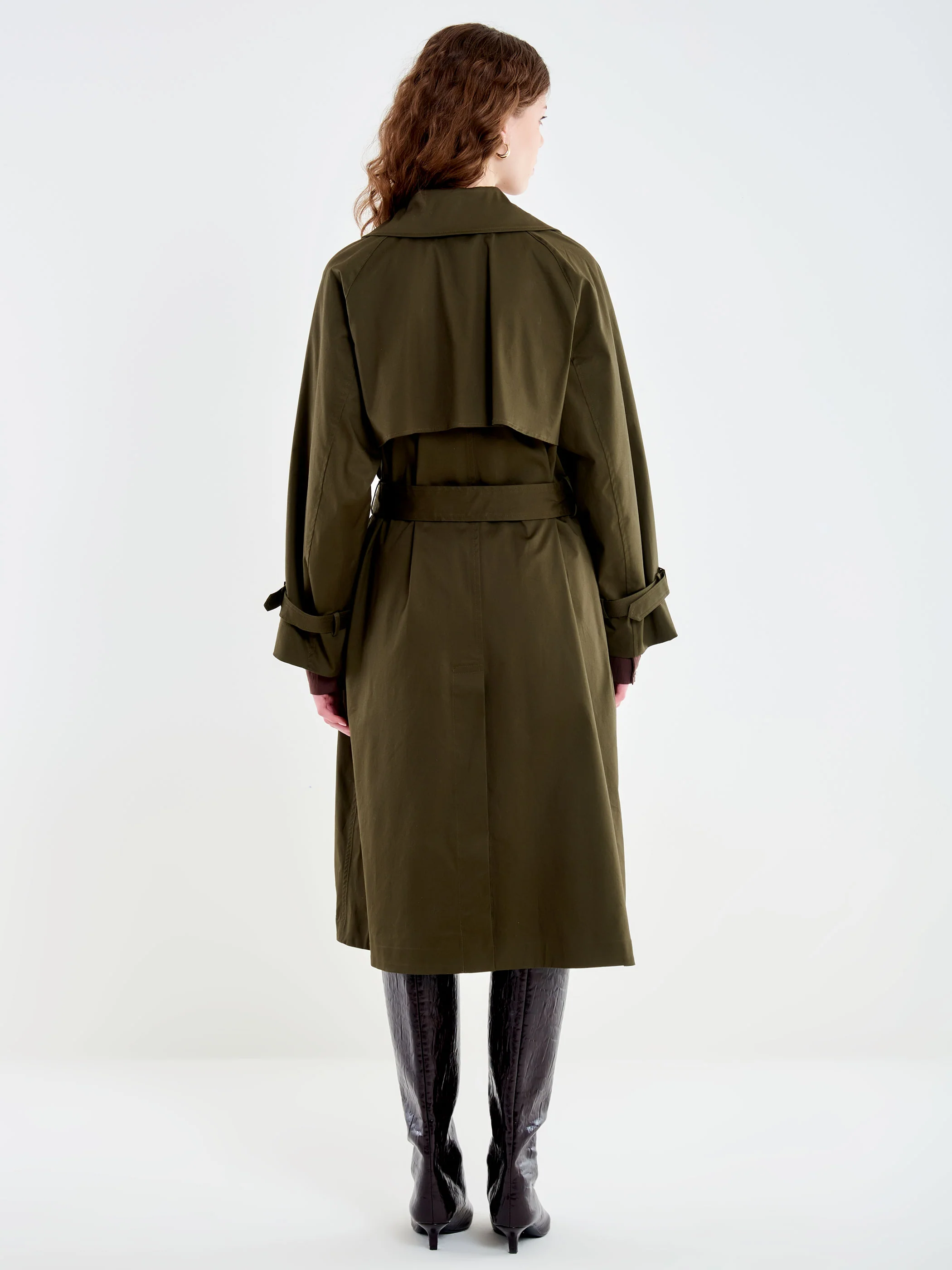 Trench lungo doppiopetto con ampio collo a rever, maniche lunghe raglan con alamari regolabili sui polsi e tasche a filettone sui fianchi. Con mantella sulla schiena. Chiusura con bottoni frontali e cintura.